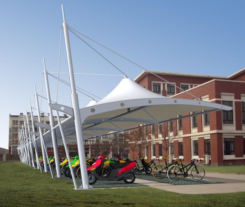 膜结构车棚设计的一般原理如下:结构设计、建筑设计、几何设计、材料和制造工艺、安装和维护、预拉伸引入机制。膜结构设计的任何连接节点在传输力路径都很简单,并且应该具有有效传递内力的约束机构与运动协调并且应该具有足够的结构强度。